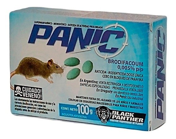 PLAGAS QUE CONTROLA: Las especies de roedores que son controladas mediante el uso del raticida rodenticida PANIC son: Rattus rattus (rata negra), Rattus norvegicus (rata noruega), Rattus alexandrinus (rata de alejandrina) y Mus musculus (raton domestíco). También controla Akondon spp., Oryzomis spp, y otros ratones silvestres.