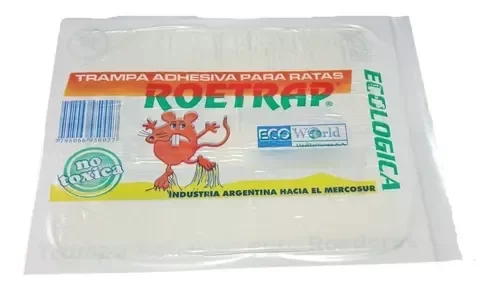 CARACTERÍSTICAS: es una trampa adhesiva para roedores, ecológica, descartable y no tóxica. Trabaja sin venenos ni aparatos mecánicos. Cuando las ratas y ratones corren sobre ROETRAP quedan atrapados y simplemente se deshecha la trampa. Contiene un poderoso adhesivo sólido que atrapa ratas, ratones y lauchas en sus recorridos habituales, eliminando la posibilidad de que mueran en lugares no deseados ocasionando malos olores, y ejerciendo así, un control efectivo día y noche. ROETRAP, no posee riesgos para niños ni animales domésticos porque no contiene venenos ni resortes, ni trae problemas en su transporte, almacenamiento o eliminación. Es no contaminante, ya que si el roedor atrapado es ocasionalmente ingerido por animales domésticos (gatos, perros, etc) no causa ninguna intoxicación.